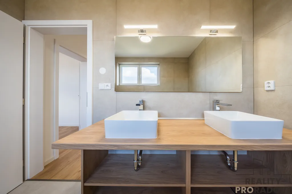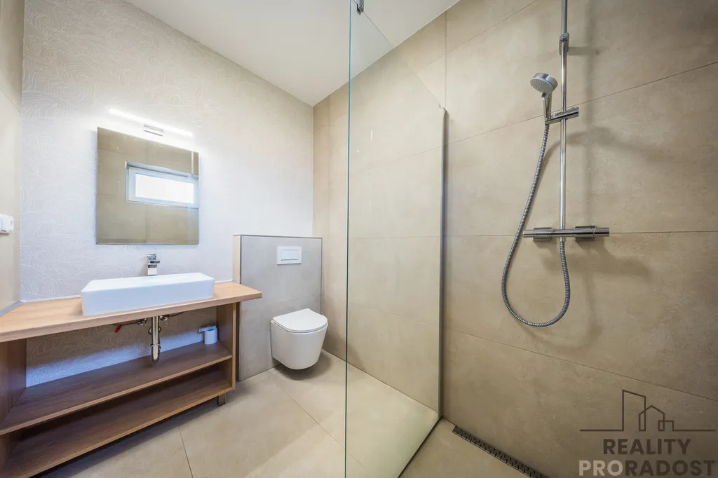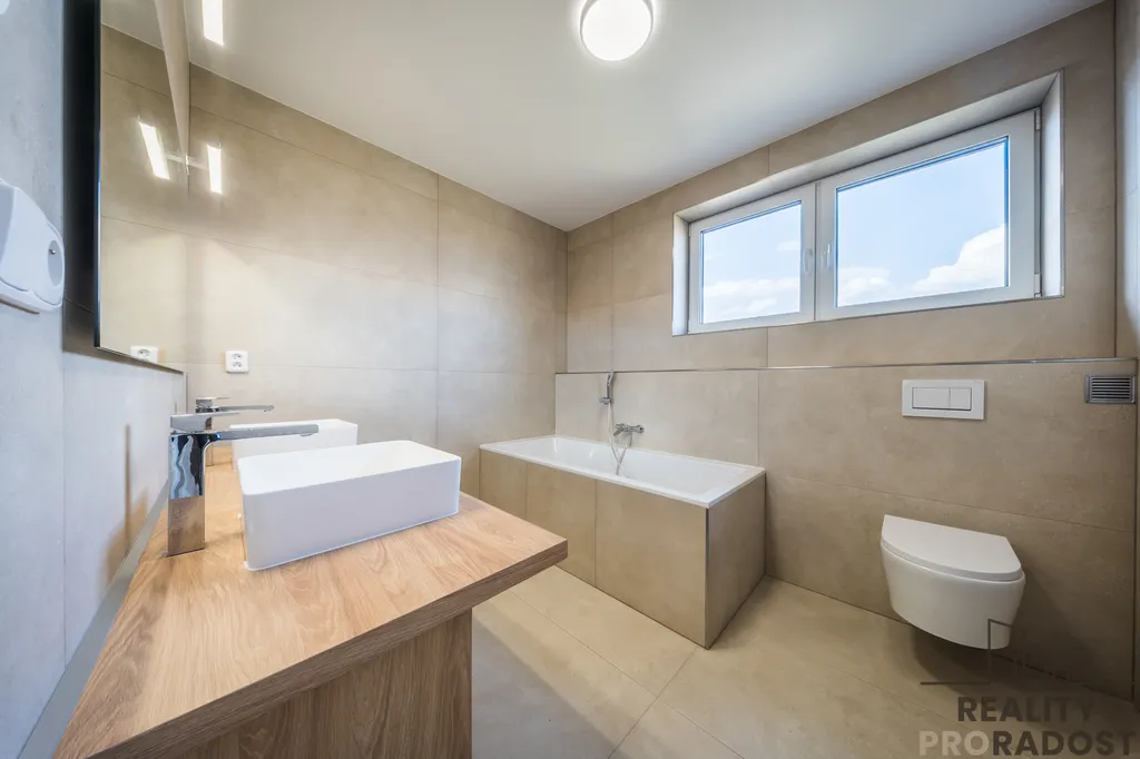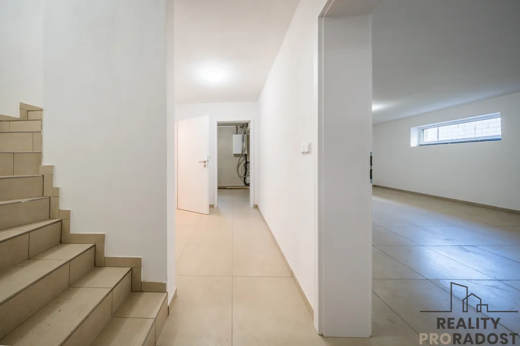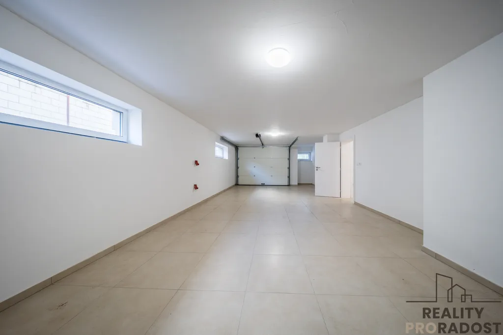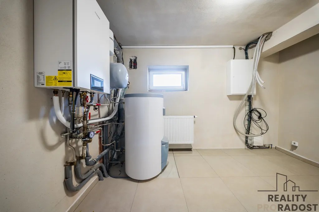 Dům je podsklepený a disponuje garáží pro dvě auta s elektrickými sekčními vraty, technickými a skladovacími prostory, včetně kotelny. Vytápění je řešeno nízkonákladovým tepelným čerpadlem, a to jak pro podlahové vytápění, tak pro přípravu teplé vody, podlaha je keramická dlažba, v celém domě jsou kvalitní plastová trojskla a příprava pro instalaci venkovních, elektrických žaluzií.