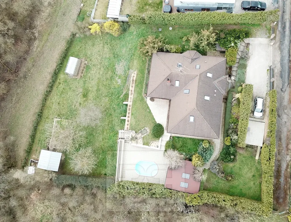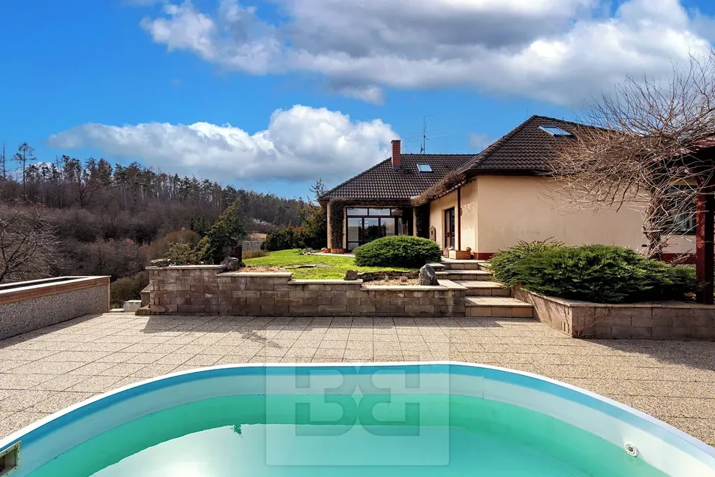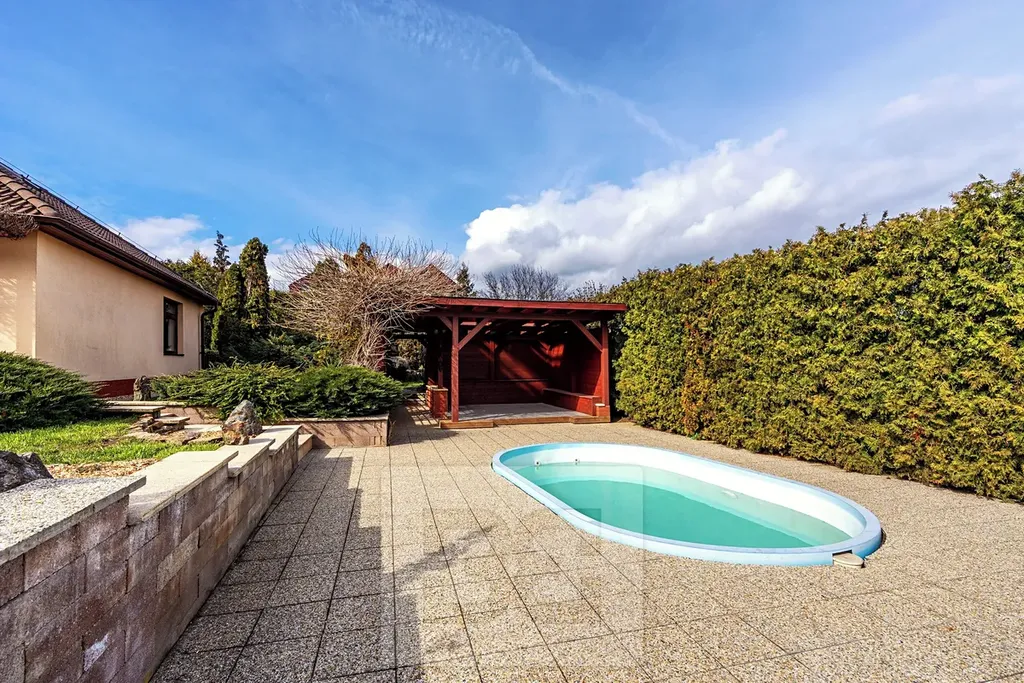Vedle domu je zastřešená pergola (45m2) se zapuštěným oválným bazénem (5x3,5m), v dolní části pozemku pak skleník (4x3m) a zahradní domek. Přístup k nemovitosti je po obecní komunikaci, jež bude letos kompletně zrekonstruována.