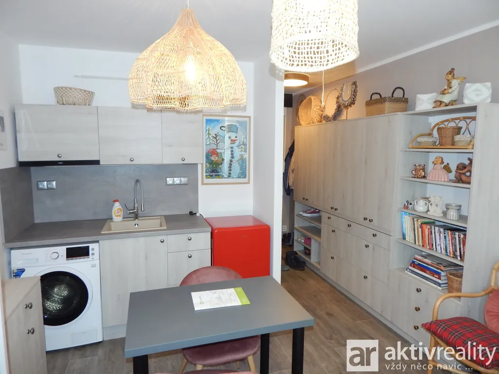 V bytě o celkové užitné ploše 19,6 m2 rozprostírající se z předsíně do obývacího pokoje spojeného s kuchyňským koutem najdeme vše potřebné pro pohodlné bydlení.