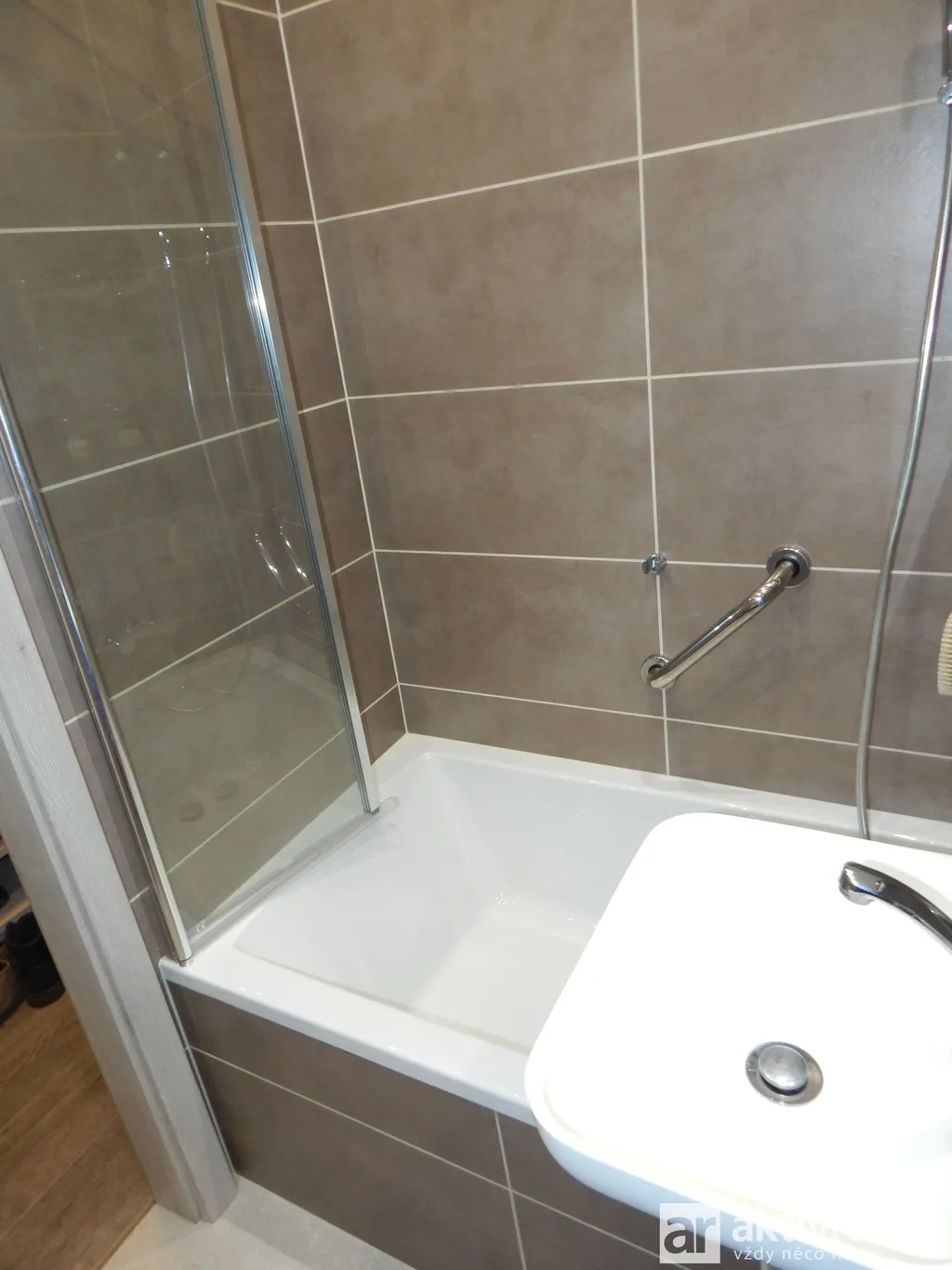 Vkusně obložená vyzděná koupelna se sprchovým koutem se zástěnou a umyvadlem je spojena s toaletou.