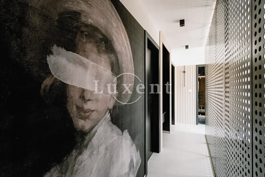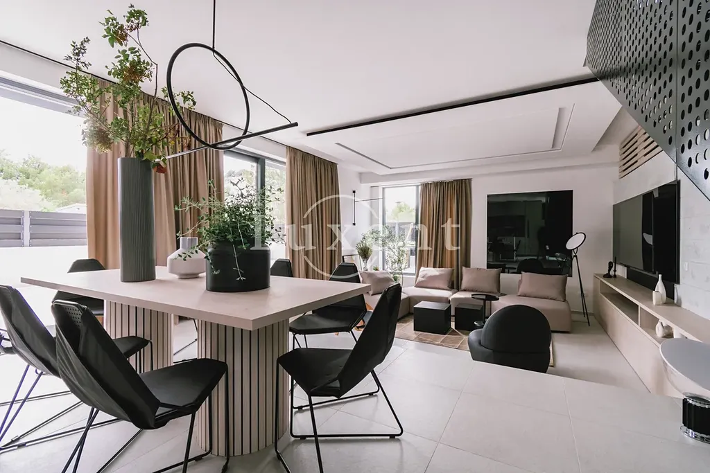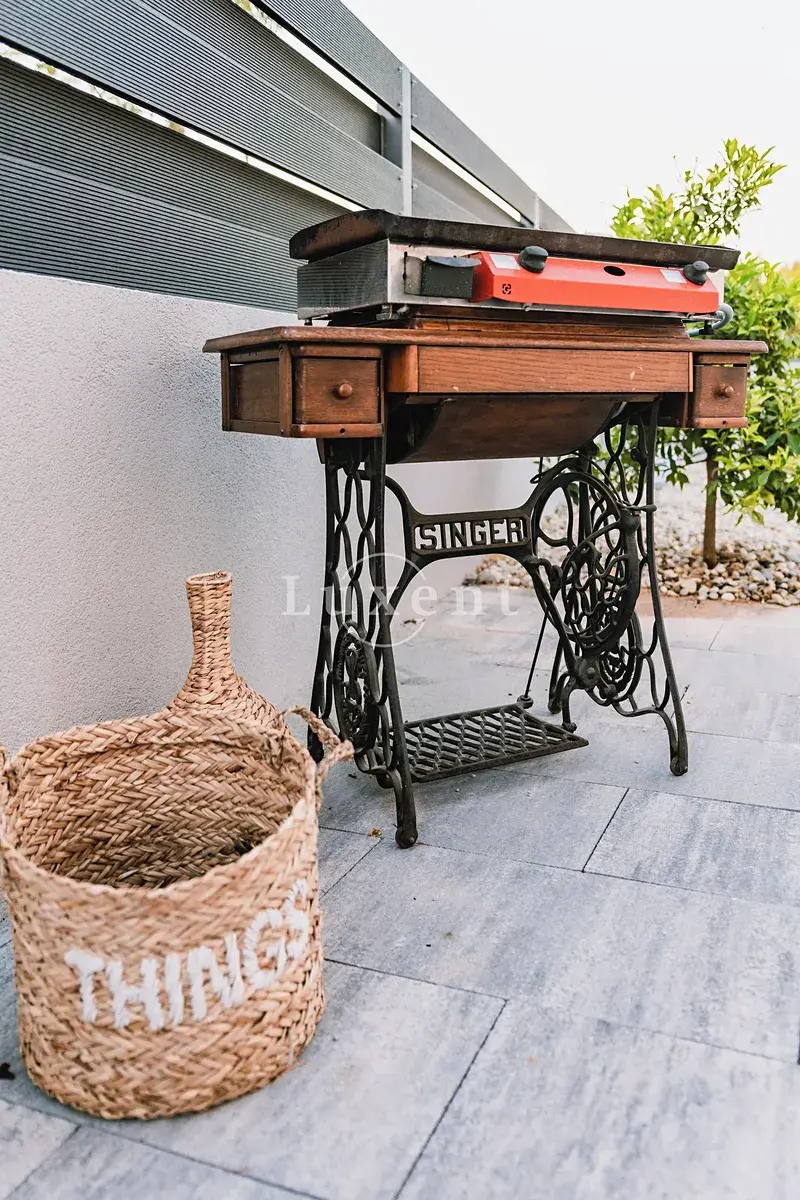 Nemovitost disponuje vybavenou kuchyní, jídelnou a prostorným obývacím pokojem s průchodem na velkou terasu s bazénem. V druhém podlaží jsou čtyři ložnice s balkony a tří koupelny. K vile náleží upravený dvůr s grilem a barem, sauna a parkovací stání na pozemku.