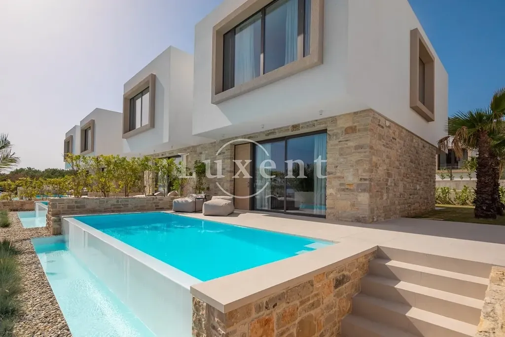Do prvního patra vede elegantní vnitřní schodiště, kde se nacházejí tři klimatizované ložnice. Hlavní ložnice má vlastní koupelnu a poskytuje dechberoucí výhled na moře, další dvě ložnice sdílejí druhou koupelnu. Interiéry jsou zařízeny s citem pro detail, ve stylu moderního minimalismu kombinovaného s přírodními prvky. Vila byla postavena z vysoce kvalitních materiálů a vybavena prémiovými technologiemi – podlahové vytápění, bezpečnostní dveře a další prvky zajišťují maximální komfort i bezpečnost.