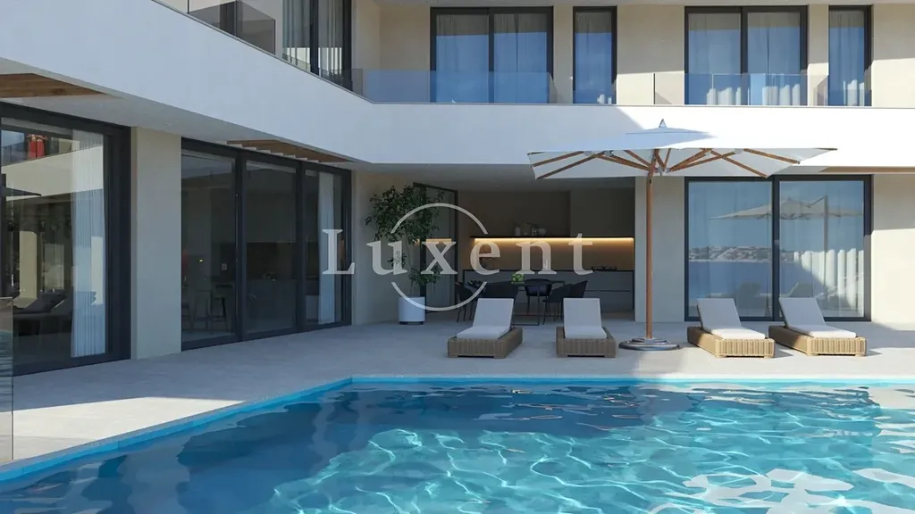 Exteriér vily nabízí výjimečné zázemí pro letní životní styl – prostorný bazén o velikosti 68,94 m² s plochou pro slunění, letní kuchyni a rozsáhlé terasy, které tvoří ideální prostředí pro rodinné oslavy i neformální setkání s přáteli. Celková kompozice domu zajišťuje dostatek soukromí, vysoký komfort a přímý kontakt s přírodou a mořem.