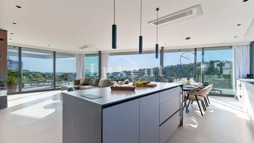 Nabízíme k prodeji novou moderní designovou vilu s dechberoucím výhledem na moře, která je ideální volbou pro všechny, kdo hledají kombinaci luxusu, pohodlí a atraktivní polohy v blízkosti moře i veškeré občanské vybavenosti. Tato výjimečná nemovitost o celkové obytné ploše 250 m2 se rozprostírá na čtyřech podlažích a nachází se na pozemku o rozloze 732 m2. Vila je kompletně zařízená a vybavená a díky velkým proskleným stěnám v každém patře nabízí přirozené denní světlo, vzdušnost a panoramatický výhled na moře i okolní přírodu.