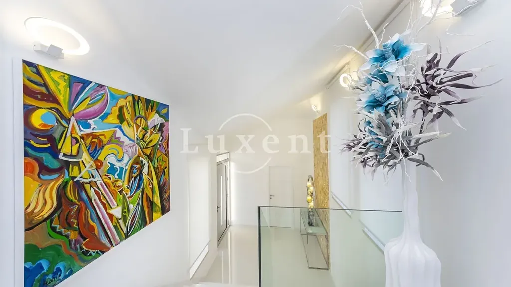 Vila o celkové obytné ploše 250 m2 je rozložena do dvou podlaží a umístěna na prostorném pozemku o rozloze 962 m2. Její elegantní bílá fasáda a čisté architektonické linie podtrhují moderní vzhled, který se harmonicky doplňuje s přírodním prostředím a klasickým středomořským dvorem plným květin a upravené zeleně.