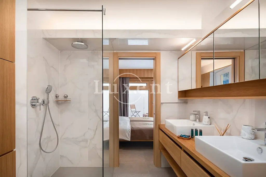 První patro je věnováno wellness zóně, která nabízí vše pro relaxaci a regeneraci: vstupní část s posilovnou, hydromasážní vířivku, tropickou sprchu, saunu, odpočinkovou místnost a prostornou terasu s výhledem na moře – ideální pro soukromý odpočinek nebo wellness víkendy s přáteli.