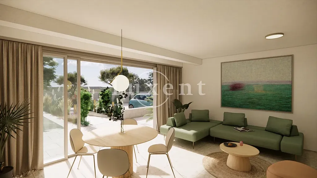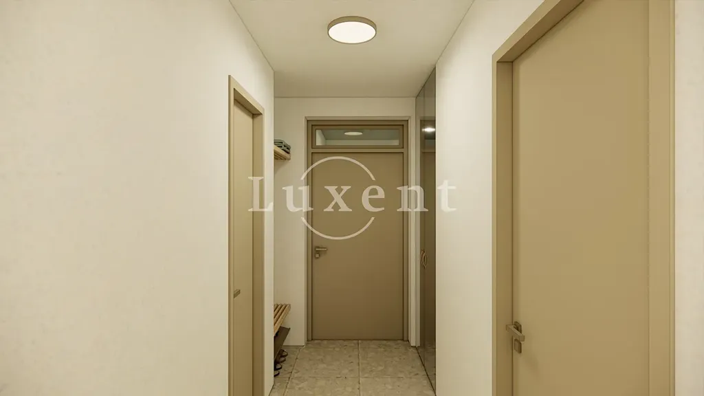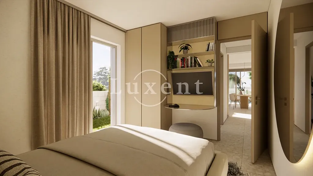 Apartmán o celkové ploše 99,1 m2 se nachází v přízemí a disponuje dvěma ložnicemi, dvěma koupelnami a velkorysým obytným prostorem s kuchyní a jídelnou. Dominantou bytu je terasa o rozloze 24 m2, která vybízí k odpočinku v soukromí a zároveň přirozeně propojuje interiér s exteriérem. Všechny apartmány jsou provedeny ve vysokém standardu s důrazem na design, funkčnost a komfort. Klienti mají možnost individuálně doladit interiér dle svých preferencí, včetně možnosti zařízení „na klíč“. K dispozici bude také společný bazén zasazený v upravené středomořské zahradě. Součástí apartmánu je vyhrazené parkovací stání.