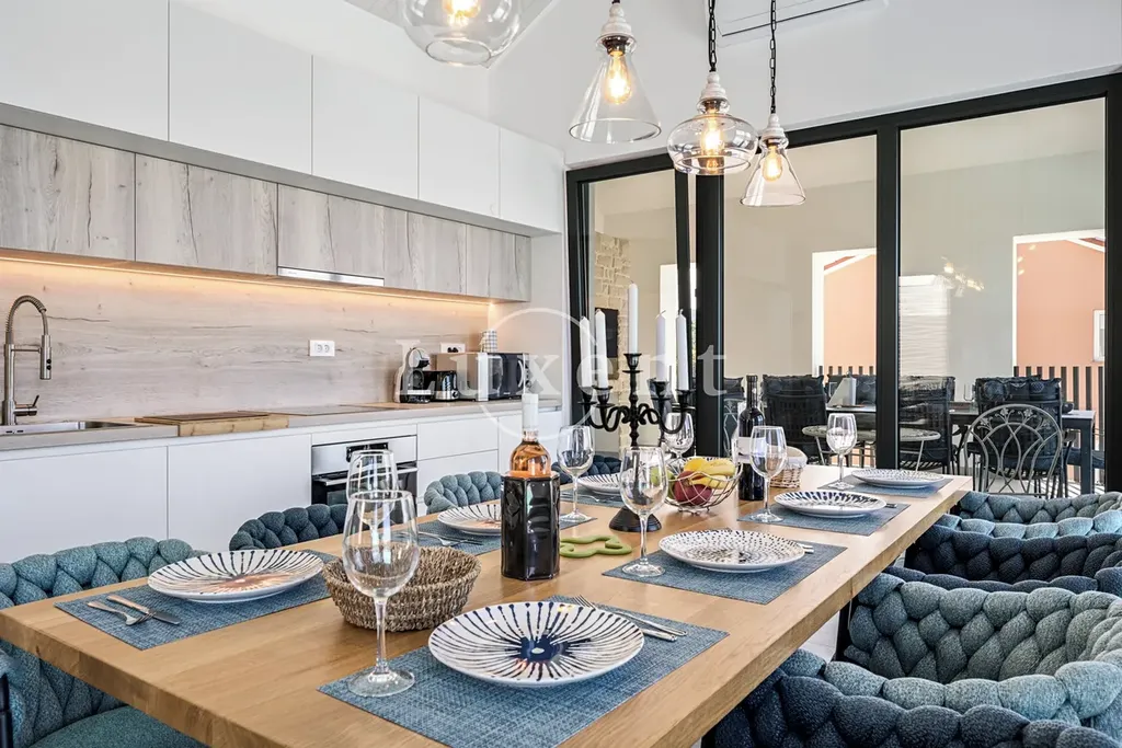 Venkovní část vily tvoří prostorná, oplocená terasa s vyhřívaným bazénem a dechberoucím výhledem na moře. K dispozici je rovněž kryté venkovní posezení s krbem a komfortním nábytkem, ideální pro letní večery.