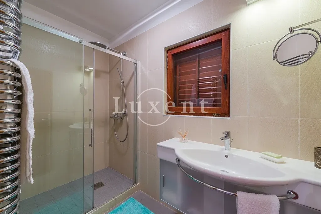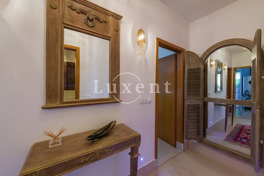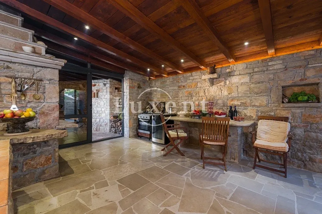Nemovitost zahrnuje hlavní dům a samostatný dům pro hosty, původně kostelní kapli, oba postavené z přírodního kamene. Interiéry jsou prostorné a elegantní, s teplou atmosférou a propracovanými detaily. K vile patří rozsáhlé terasy, venkovní jídelní kouty a velká letní kuchyně s grilem – ideální prostor pro pohodové chvíle s rodinou i přáteli.