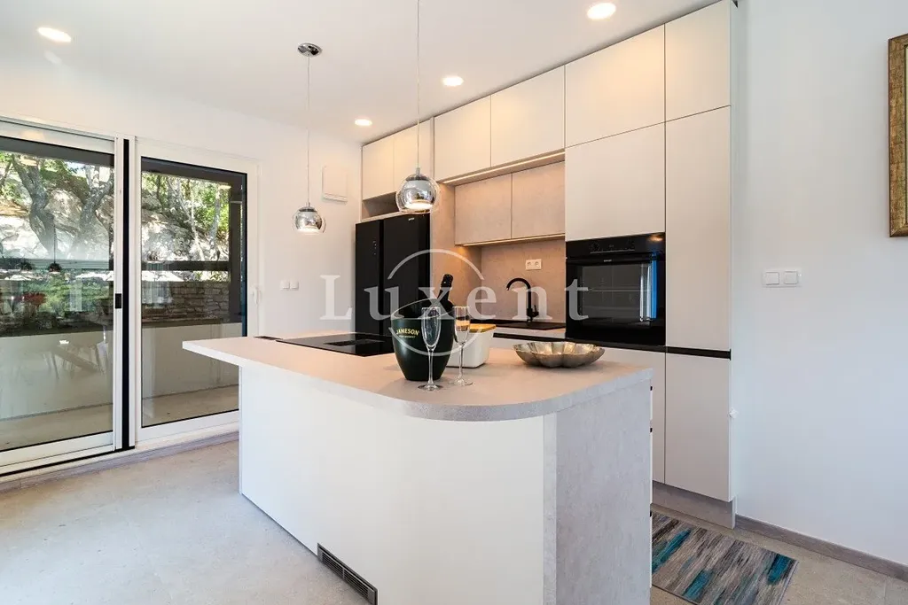V přízemí se nachází prostorný obývací pokoj s vstupem na terasu, kuchyně s jídelnou, chodba, dvě ložnice a dvě koupelny. V patře je třetí ložnice s vlastní koupelnou a balkonem. Udržovaná zahrada s mediteránskými rostlinami nabízí další terasu u moře, venkovní kuchyň, posezení s grilem a sprchu. Před domem vedou schody přímo k moři a je zde možnost kotvení menší lodě.