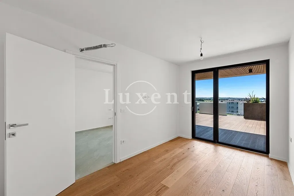 Byt nabízí otevřený obývací prostor o velikosti 18 m², který poskytuje dostatek místa pro pohodlné bydlení a relaxaci. Součástí je ložnice s klidným zázemím pro soukromí, šatna umožňující praktické uspořádání věcí a komora pro uložení všeho potřebného. Koupelna je vybavena prvotřídní sanitou značek Hansgrohe a Catalano. I přes kompaktní rozměry je interiér světlý a vzdušný díky velkým proskleným oknům, keramickým dlažbám a dřevěným parketám nejvyšší třídy. Z obývacího prostoru je vstup na krytou terasu o velikosti 19 m² s výhledem na moře, kde si můžete odpočinout, stolovat venku nebo vytvořit venkovní lounge.