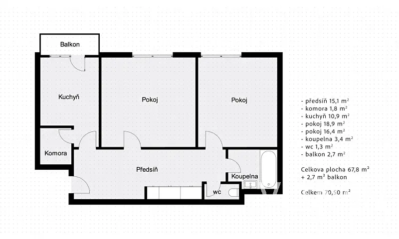 Dispozice bytu zahrnuje vstupní předsíň, samostatnou kuchyň se spíží, obývací pokoj, ložnici, koupelnu s vanou a WC, Pokoje i kuchyň jsou přístupné z předsíně. Z kuchyně je přístup na balkon orientovaný do dvora a na jihozápad. Vytápění je centrální. V kuchyní je plynový sporák, lednička a v koupelně pračka.