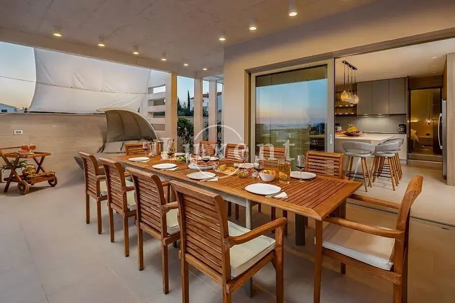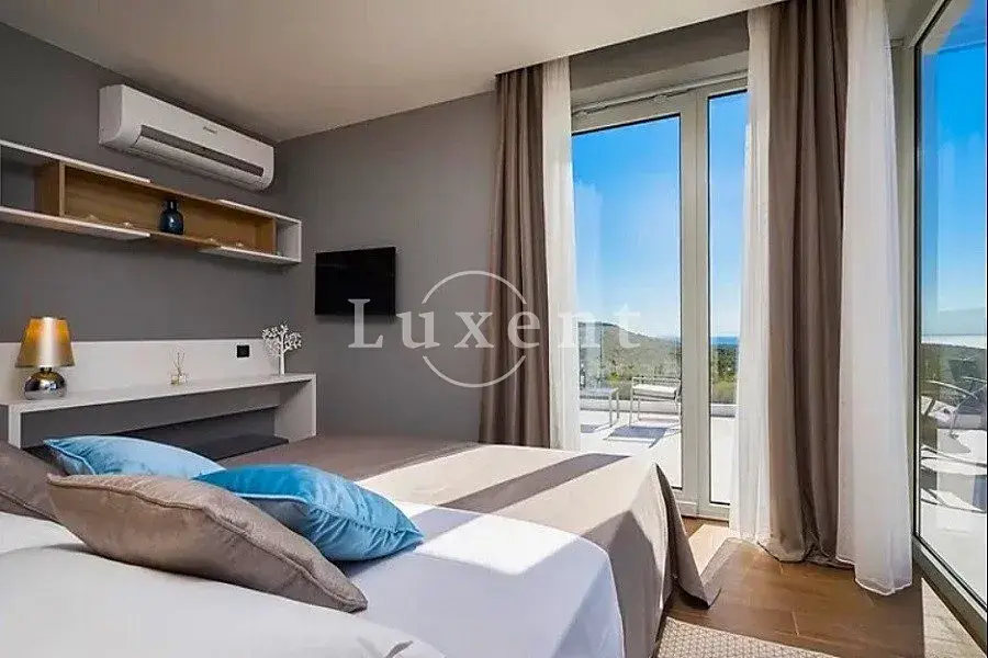 V prvním patře jsou tři elegantní ložnice, každá s vlastní koupelnou a přístupem na jižně orientované terasy, které poskytují dechberoucí panoramatický výhled na moře a okolní přírodu.
