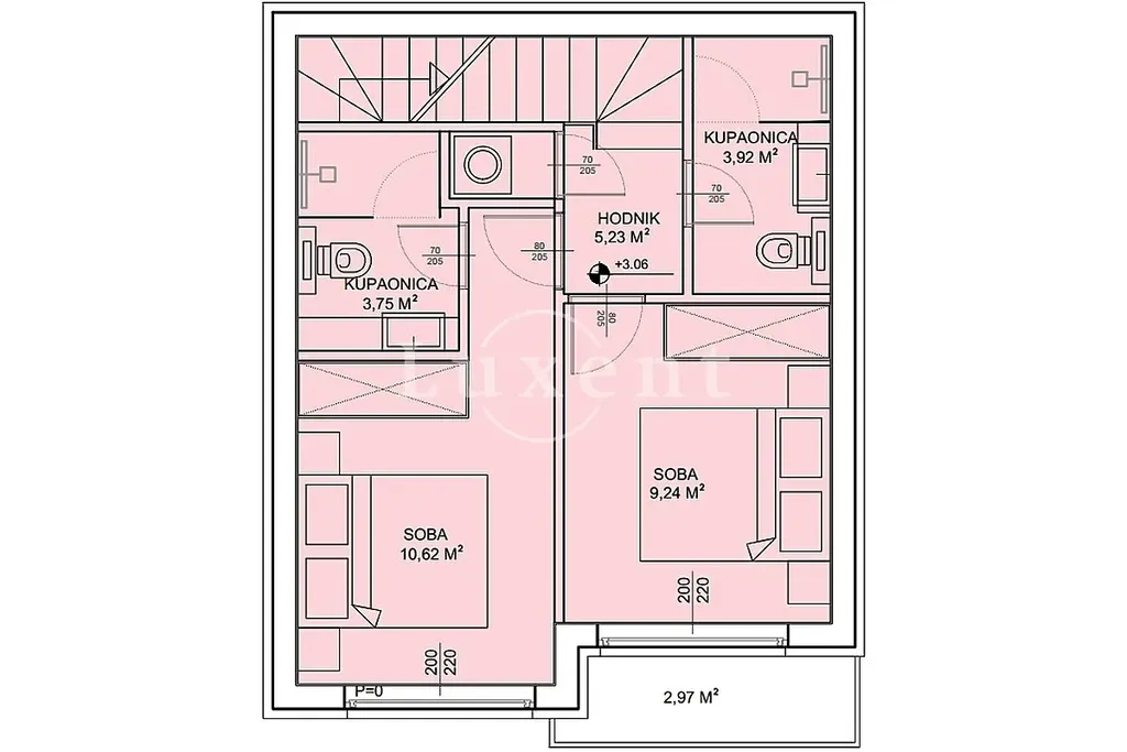 Na patře se nachází dvě prostorné ložnice, prádelna a sdílená koupelna. Hlavní ložnice má vlastní koupelnu, druhá ložnice nabízí přístup na soukromou lodžii s výhledem na moře. Dispozice apartmánu je navržena tak, aby byl prostor maximálně efektivně využitý a aby všechny obytné místnosti měly dostatek denního světla.