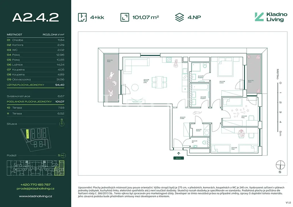 Nabízíme ke koupi moderní byt 4+kk o podlahové ploše 101 m² se dvěma terasami 7,9 a 6,5 m² v rezidenčním projektu Kladno Living, který vzniká v jedné z nejatraktivnějších lokalit města Kladno – Kročehlavy. Tento nový developerský projekt představuje jedinečnou příležitost pro ty, kteří hledají nové byty v Kladně nebo investici do nemovitosti s vysokým potenciálem zhodnocení.