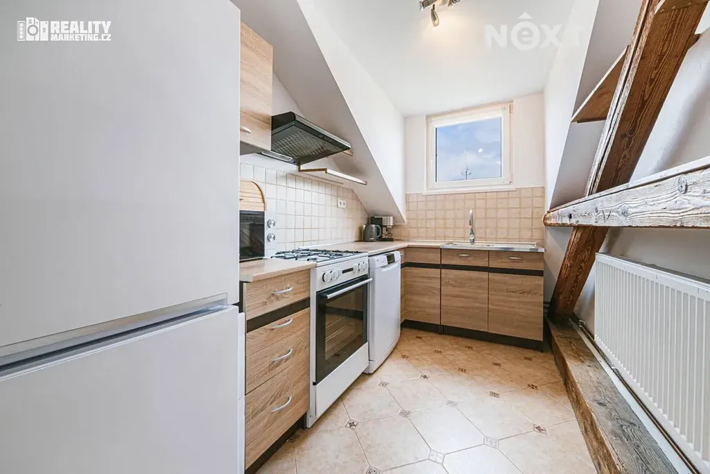 Nabízíme k dlouhodobému pronájmu velmi pěkný, stylový a dobře udržovaný podkrovní byt o dispozici 2+1 s podlahovou plochou 54 m², k němuž náleží také prostorná dobře krytá lodžie orientovaná na východ – ideální pro ranní kávu, bylinky i relax po práci. Bytová jednotka je situována v posledním 3. patře cihlového bytového domu o osmi bytových jednotkách, který je ve velmi dobrém technickém stavu a v blízké době ho čeká navíc revitalizace. Společné prostory domu jsou vzorně udržované – k dispozici je čistá a prostorná kočárkárna, kolárna i sušárna, což ocení nejen rodiny s dětmi, ale i aktivní jednotlivci a páry.