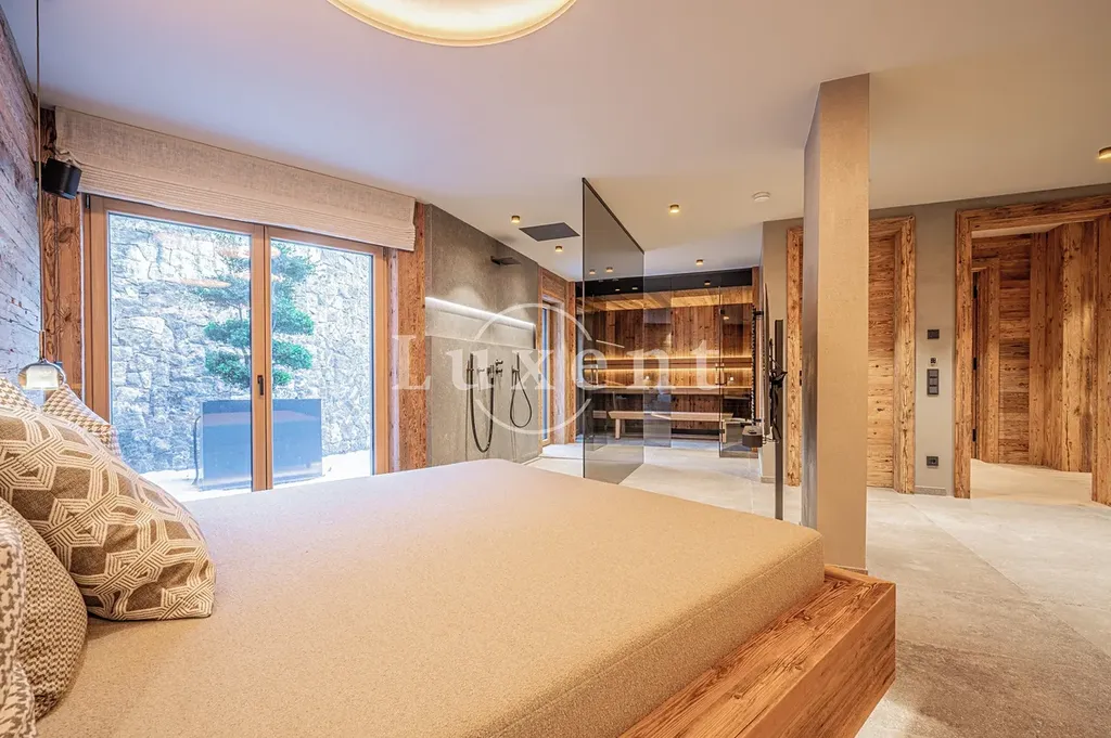 Horní patro nabízí prostorný obývací, jídelní a kuchyňský kout s vysokým stropem a velkými okny, které umožňují nádherný výhled na okolní hory. Kvalitní kuchyně je vybavena spotřebiči Miele, Bora a Qooker, což zaručuje prvotřídní zážitek z vaření. V přízemí se nachází luxusní hlavní ložnice s vlastní koupelnou a šatními skříněmi. Další dvě ložnice v suterénu jsou zařízeny exkluzivním nábytkem a mají vlastní koupelny.