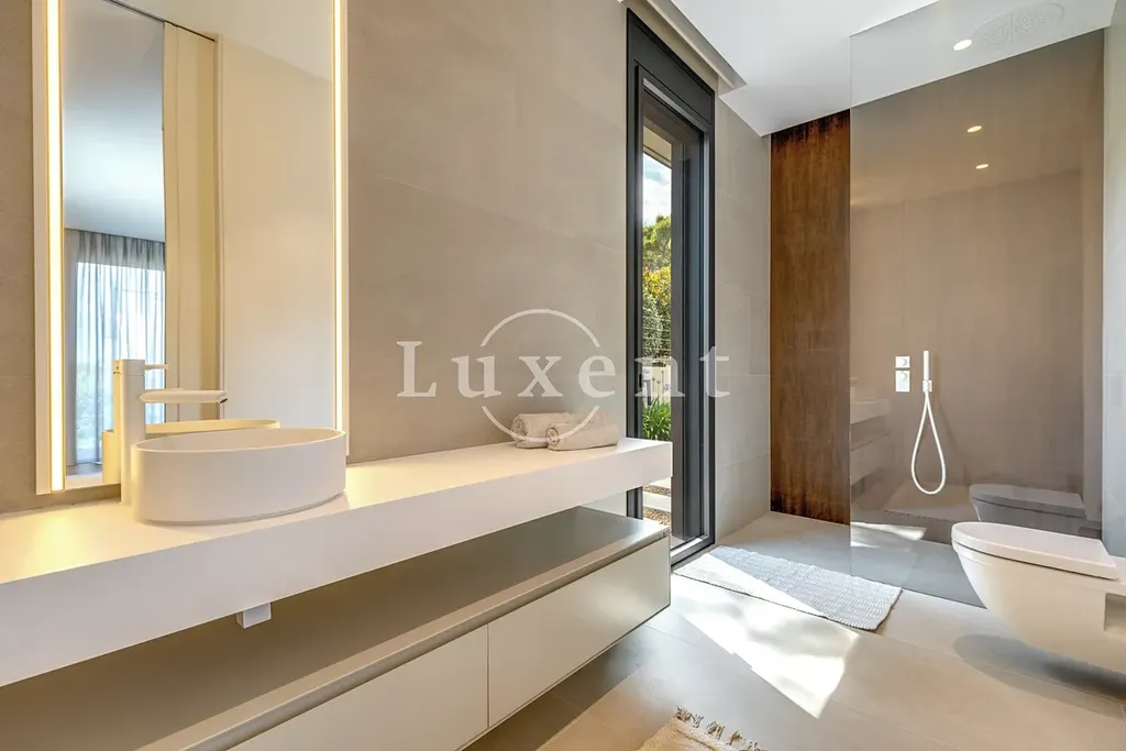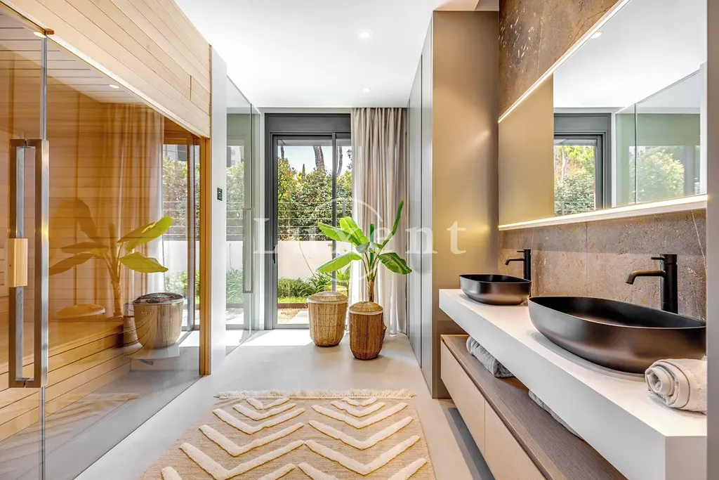 Vila se rozprostírá na třech podlažích a nabídne celkem 7 prostorných pokojů, z nichž 4 jsou luxusní ložnice s vlastními koupelnami. Interiérové vybavení zahrnuje keramické dlažby nejvyšší kvality, designovou kuchyni, klimatizaci s funkcí vytápění a chlazení, podlahové vytápění, saunu a oboustranný krb. Pro maximální pohodlí je k dispozici také prostorný výtah a vysokorychlostní internet.