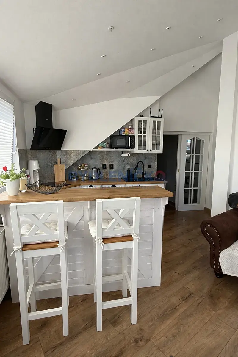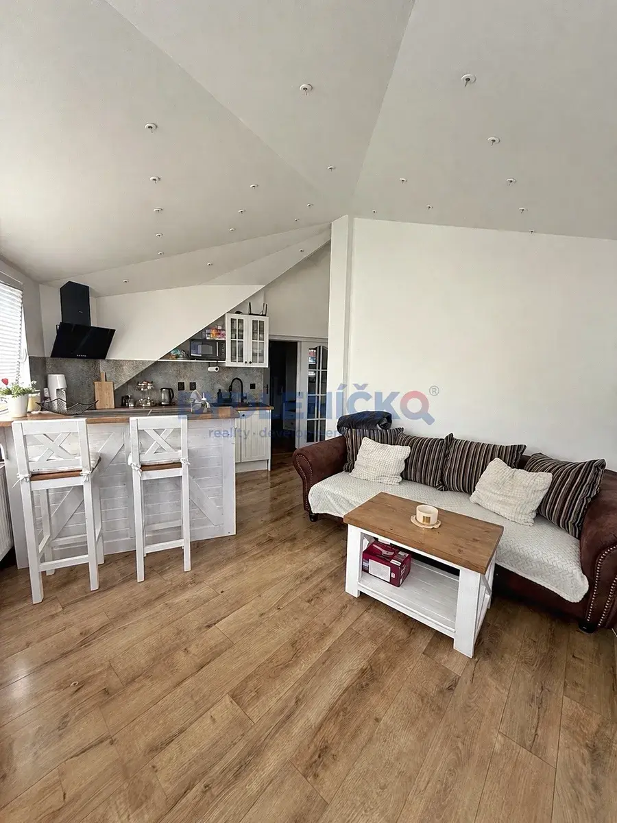 Tento atypický byt je tvořen dvěmi velmi prosvětlenými pokoji: ložnice s orientací na východ a obývací pokoj s elektrickým krbem, kuchyňským koutem a barovým sezením. Dále je zde prostorná předsíň a koupelna s vířivou vanou a toaletou. Byt se pronajímá v kompletně vybaveném stavu tak, jak je patrné z fotografií.