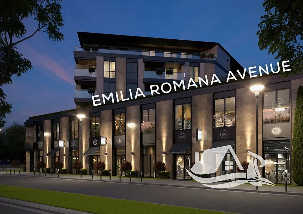 Apartmán v komplexu Emilia Romana Avenue je přesně takovým prostorem. Nachází se ve druhém podlaží a už při vstupu působí svěže, vzdušně a promyšleně. Dispozice je jednoduchá, ale funkční – obývací pokoj s kuchyňským koutem tvoří přirozené centrum bytu, kde se odehrává každodenní život. Velká okna propojují interiér s balkonem a přivádějí dovnitř světlo i klid okolního prostředí.