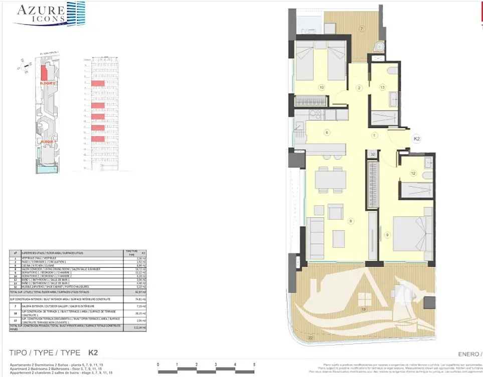 Apartmán o celkové ploše 112,16 m² a užitné ploše 74,81 m² je navržen s důrazem na světlo, prostor a funkčnost. Dominantou je obývací pokoj propojený s kuchyní, který plynule navazuje na prostornou terasu o velikosti 28,15 m². Druhá venkovní část v podobě balkonu o rozloze 7,15 m² doplňuje celkový komfort a nabízí další úhel pohledu na okolí. Jedna terasa směřuje k moři a ikonické skále Peñón de Ifach, druhá nabízí klidnější výhled na solné laguny Calpe. Dvě ložnice poskytují dostatek soukromí a koupelna je řešena moderně a prakticky. Součástí je také sklep a vlastní parkovací místo.
