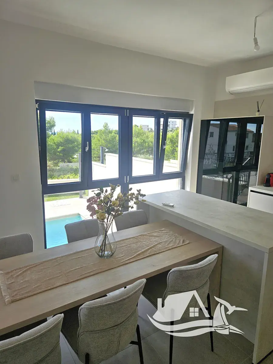 V atraktivní části města Vodice, na mírném vyvýšení v klidné slepé ulici, se nachází novostavba luxusně zařízeného dvojdomu s panoramatickým výhledem na moře a město.