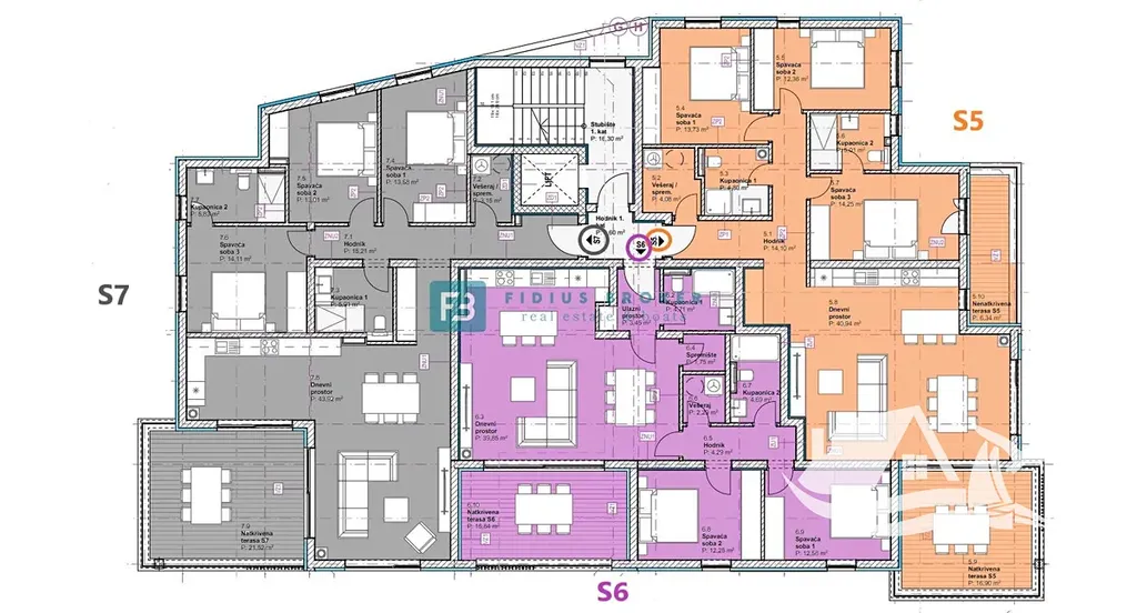 Apartmán S5 má celkovou užitnou plochu 120,89 m² a je orientován na jihovýchod. Dispozice zahrnuje vstupní prostor, prádelnu či komoru, tři ložnice, chodbu, dvě koupelny a otevřený koncept kuchyně s jídelnou a obývacím pokojem. Obytná část navazuje na prostornou krytou terasu o velikosti 16,90 m² a další nekrytou terasu o velikosti 6,34 m². Z obou teras i ze všech místností se otevírá výhled na moře, což je výrazný benefit této nabídky. Součástí apartmánu je sklepní kóje v suterénu a jedno venkovní parkovací místo.