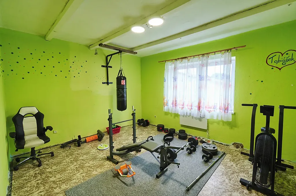 • První podlaží (přízemí): kancelář, skladovací prostory, toalety, sprcha a rozlehlý sál (aktuálně využívaný jako sklad) – celková plocha 356 m²