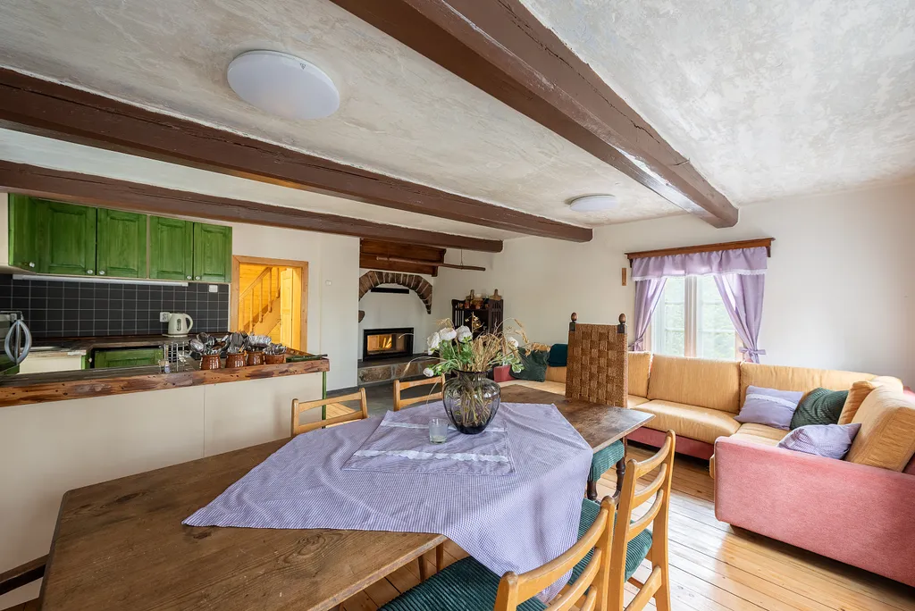 Dominantou domu je renovovaný pískovcový komín s oboustrannou krbovou vložkou, který tvoří přirozené srdce celého prostoru.