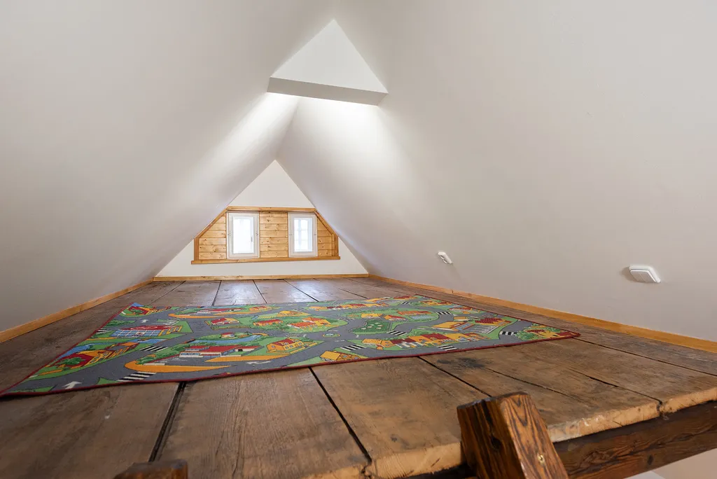 Do podkroví vede masivní dřevěné schodiště, které ústí do prostorné haly s přípravou na druhou kuchyň. Podkroví dále nabízí druhou koupelnu, dvě samostatné ložnice a velkorysý otevřený prostor s přiznanými trámy, který je ideální jako dětský pokoj, herna nebo odpočinková zóna.
