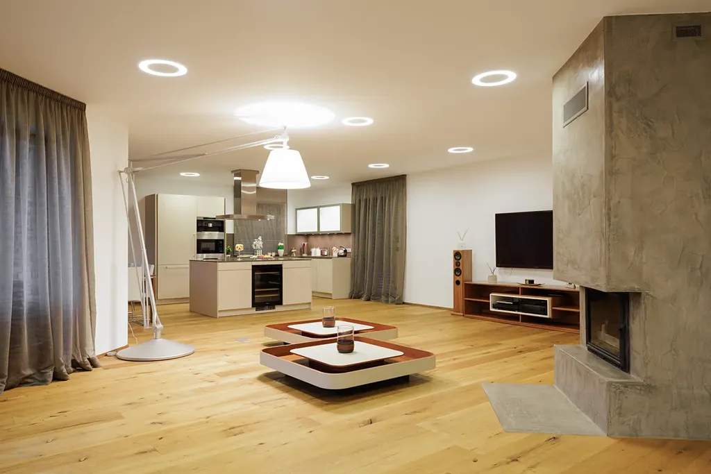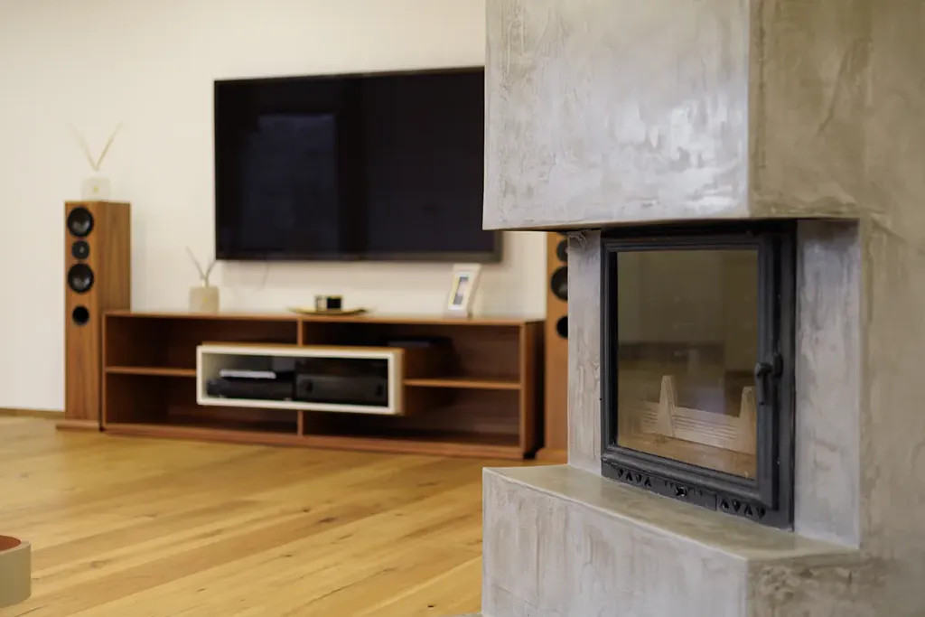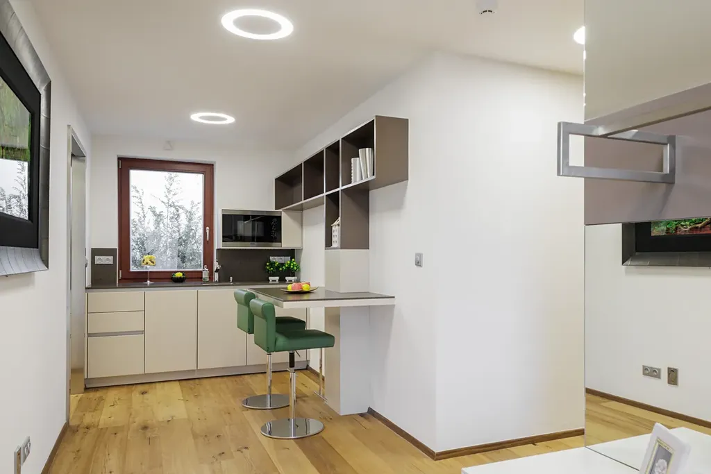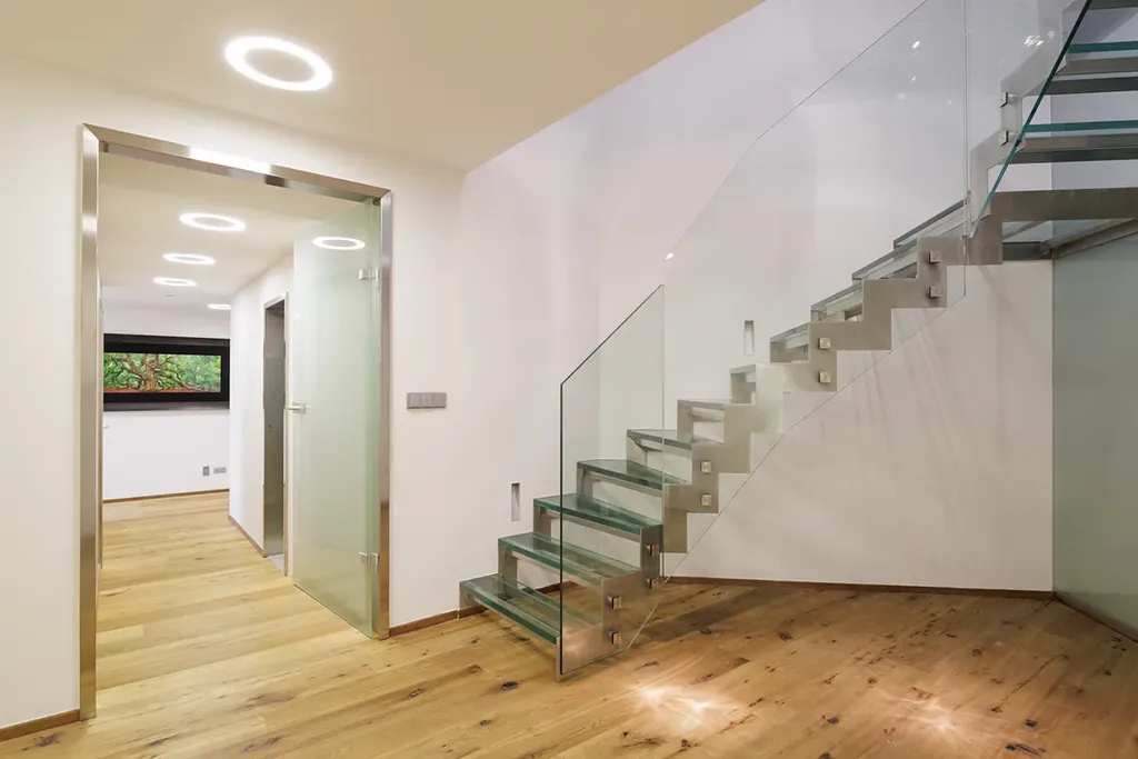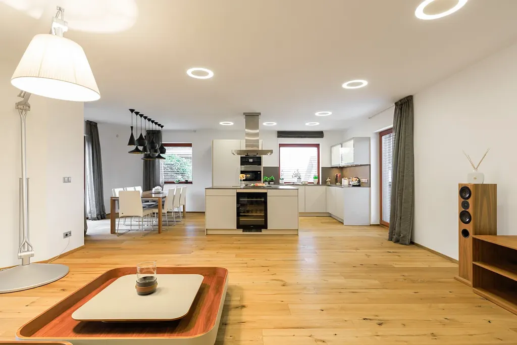 Velká okna od podlahy až ke stropu poskytují nepřerušované výhledy do okolní krajiny a prosvětlují interiér. Na většině oken jsou venkovní žaluzie, které zajišťují ochranu před sluncem a zároveň poskytují soukromí. Podlahy jsou z kvalitního dubového dřeva, obývací pokoj je vybaven krbem a kuchyňské linky jsou vybaveny spotřebiči Miele. Vytápění je zajištěno podlahovým topením, které je rozvedeno prakticky po celém domě, u větších oken je doplněno o podlahové radiátory. Krbová vložka je teplovodní, napojená na tepelnou soustavu, což umožňuje vytápění i pomocí krbu. Dvojgaráž a další parkovací místo na pozemku zajišťují dostatek parkovacích kapacit. Dům je chráněn zabezpečovacím systémem a napojen na PCO (pult centralizované ochrany).