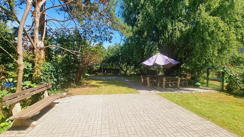 Zahrada je osazena spoustou zeleně a vedle laviček je zde také k dispozici sušák na prádlo.