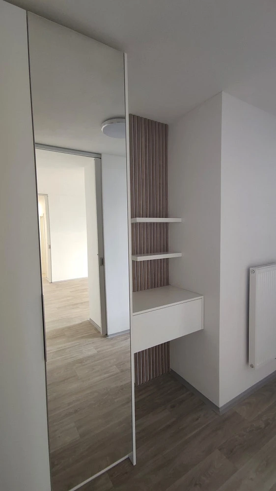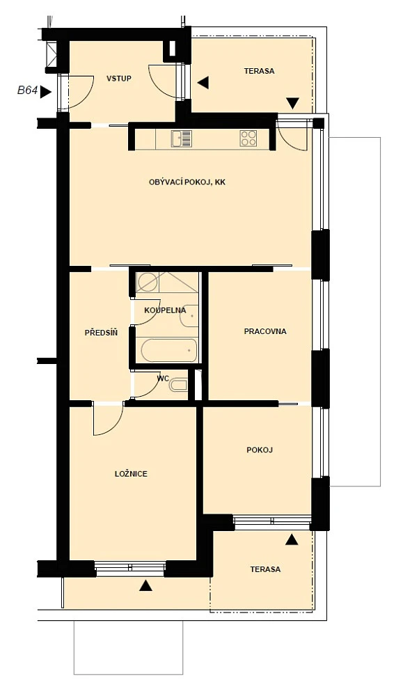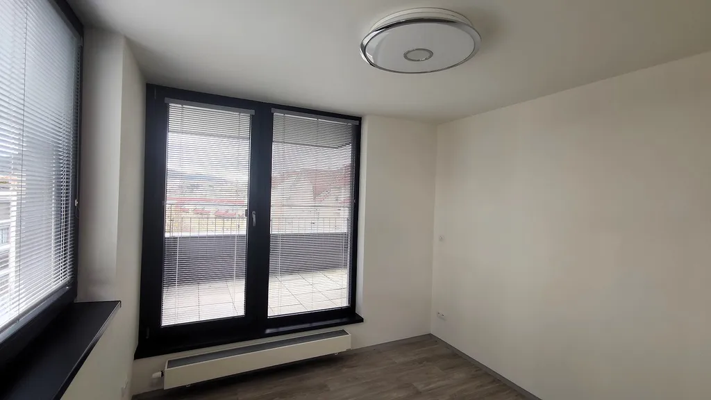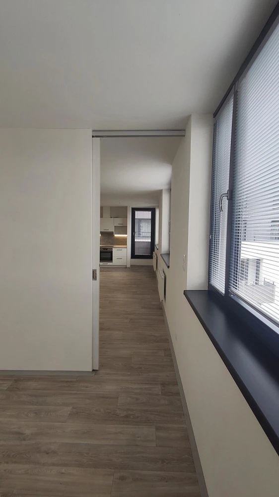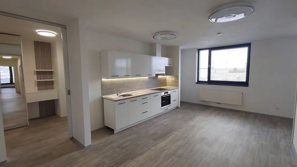 Dominantou bytu je světlý obývací pokoj s kuchyňským koutem o velikosti 26 m², který tvoří přirozené centrum domácnosti. Na obytnou část navazují další místnosti – samostatná pracovna, ideální pro práci z domova, či hrací kout pro děti nebo klidnou studijní zónu, dále pokoj a v klidnější části bytu je ložnice s vestavěnými skříněmi. Dispozice bytu dále zahrnuje předsíň, vstupní halu, koupelnu a samostatné WC.