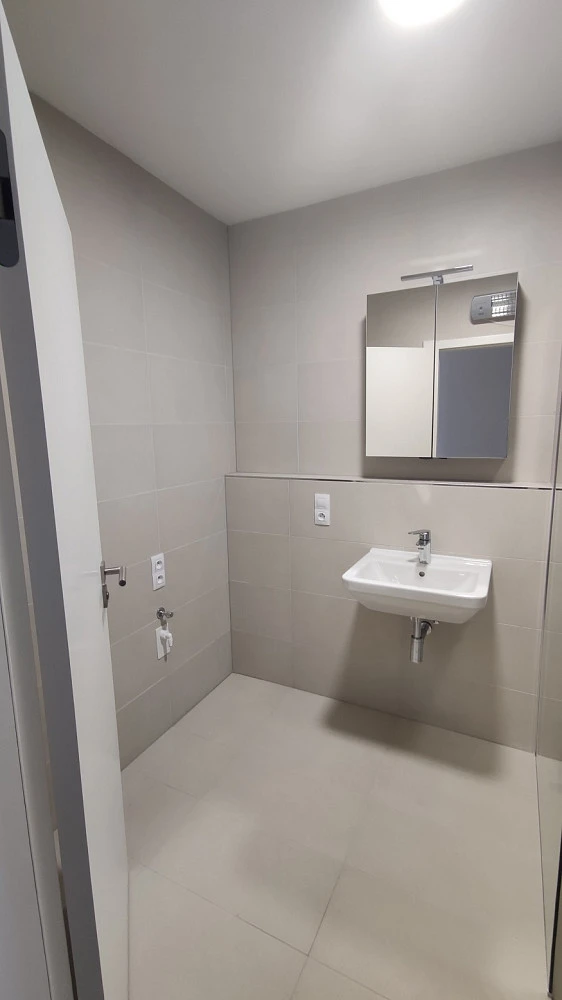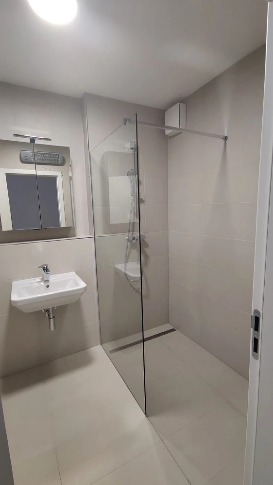 Koupelna a WC jsou obloženy velkoformátovou kalibrovanou keramikou (600 × 300 mm) v elegantním pískovcovém odstínu s pololeskem. Sprchový kout je řešen dlažbou ve spádu s nerezovým odvodňovacím žlábkem.