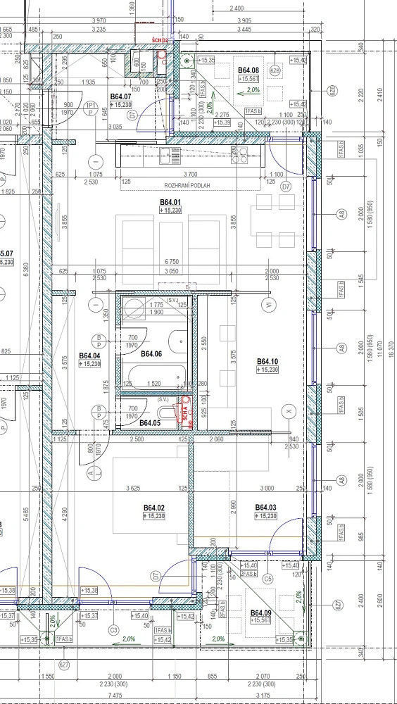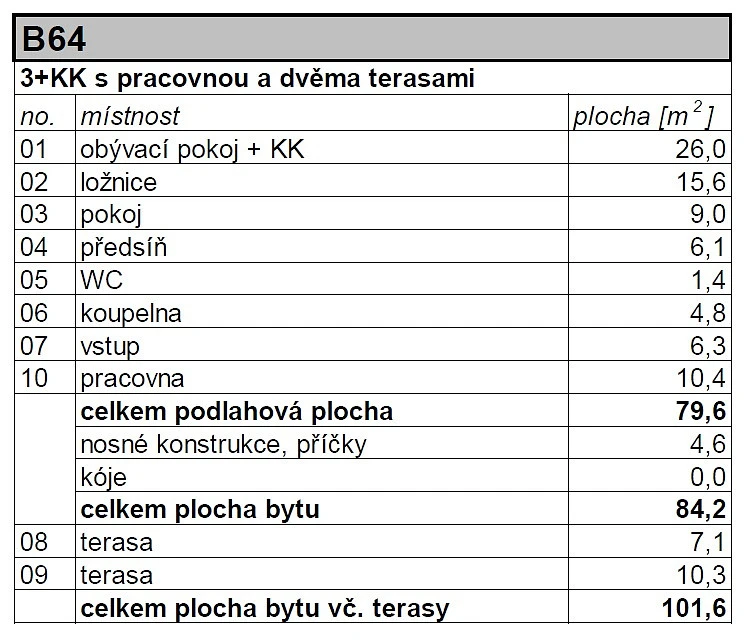 Podlahová plocha bytu: 79,6 m² Celková plocha bytu: 84,2 m² Terasy: 7,1 m² a 10,3 m²