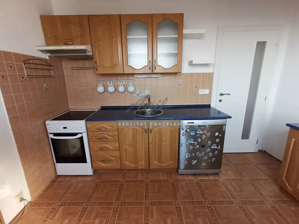 Kuchyň - kuchyňská linka, digestoř, lednice s mrazákem, samostatně stojící elektrický sporák s elektrickou troubou, varná konvice, samostatně stojící skříňka s 5 šuplíky, sušička na prádlo.