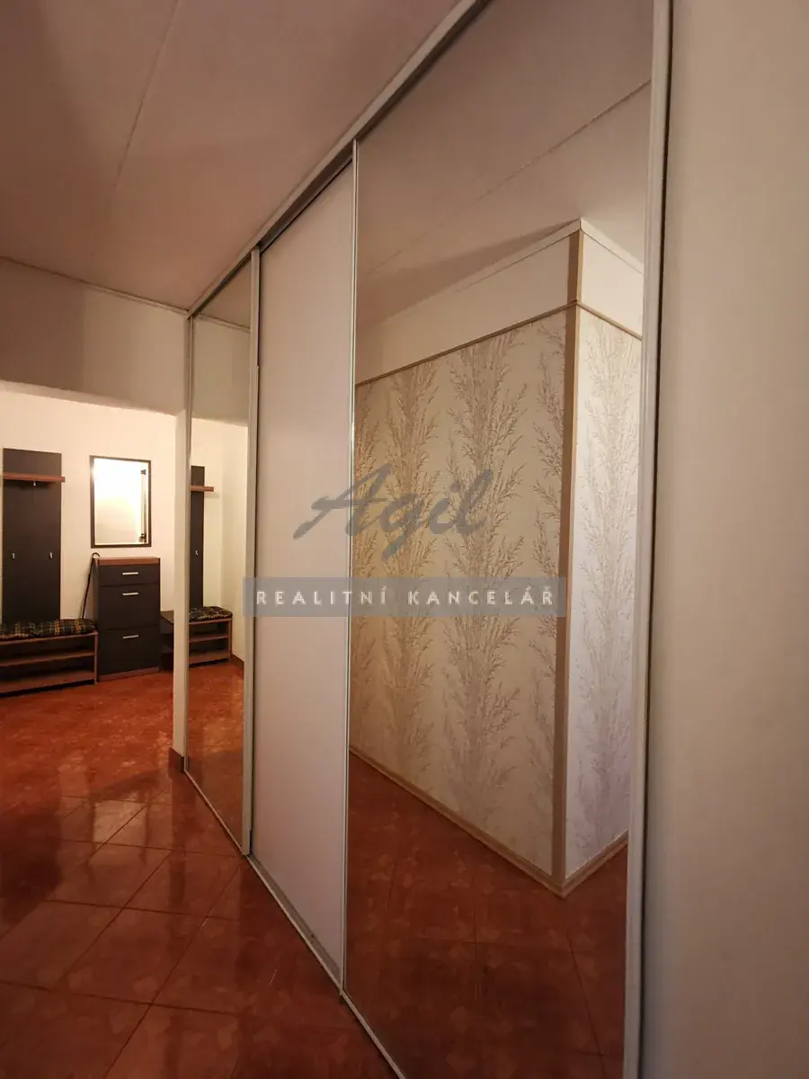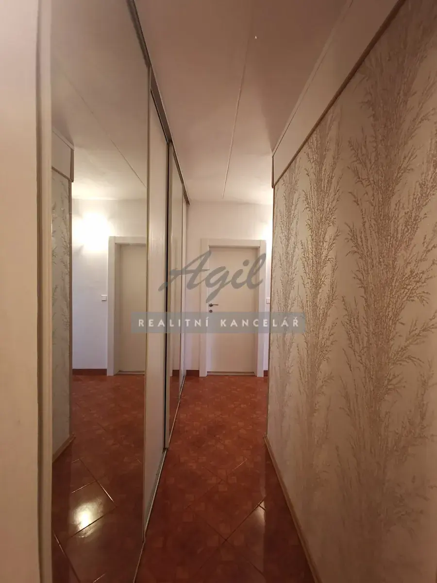 Předsíň – vestavěná 4dílná šatní skříň, nástěnné zrcadlo, botník, věšáková stěna s posezením, bezpečnostní vstupní dveře do bytu.