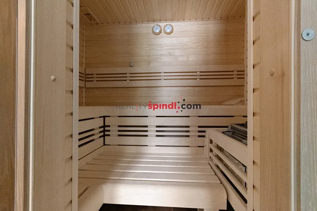 Součástí bytu je také privátní wellness zóna se saunou, sprchou a odpočinkovým prostorem – ideální místo pro regeneraci po dni stráveném na horách.