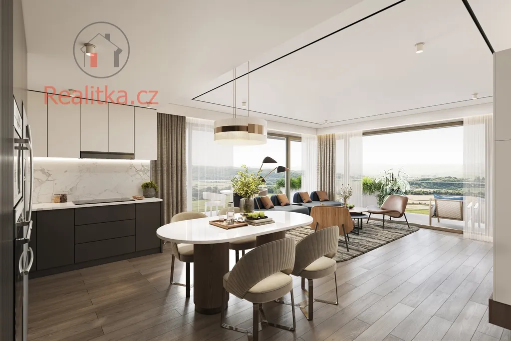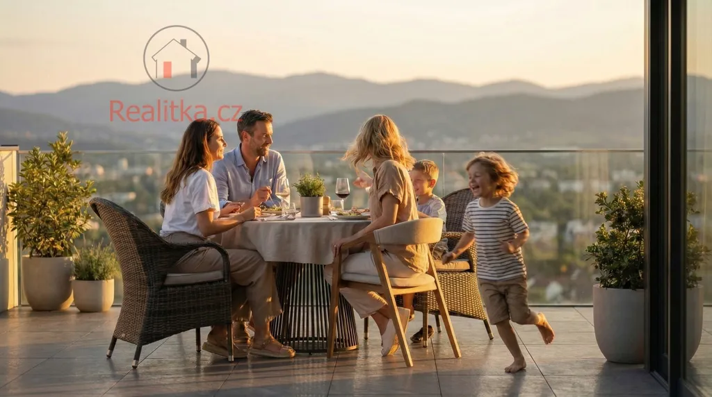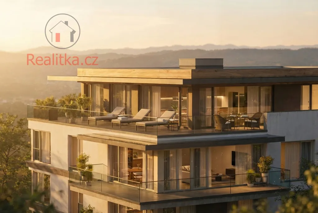 Dominantou této výjimečné nemovitosti je terasa o rozloze 75 m², která obklopuje byt přes tři světové strany a je přístupná ze všech pokojů a jedné koupelny. Nabízí tak unikátní propojení interiéru s exteriérem, dostatek soukromí i dechberoucí výhledy.