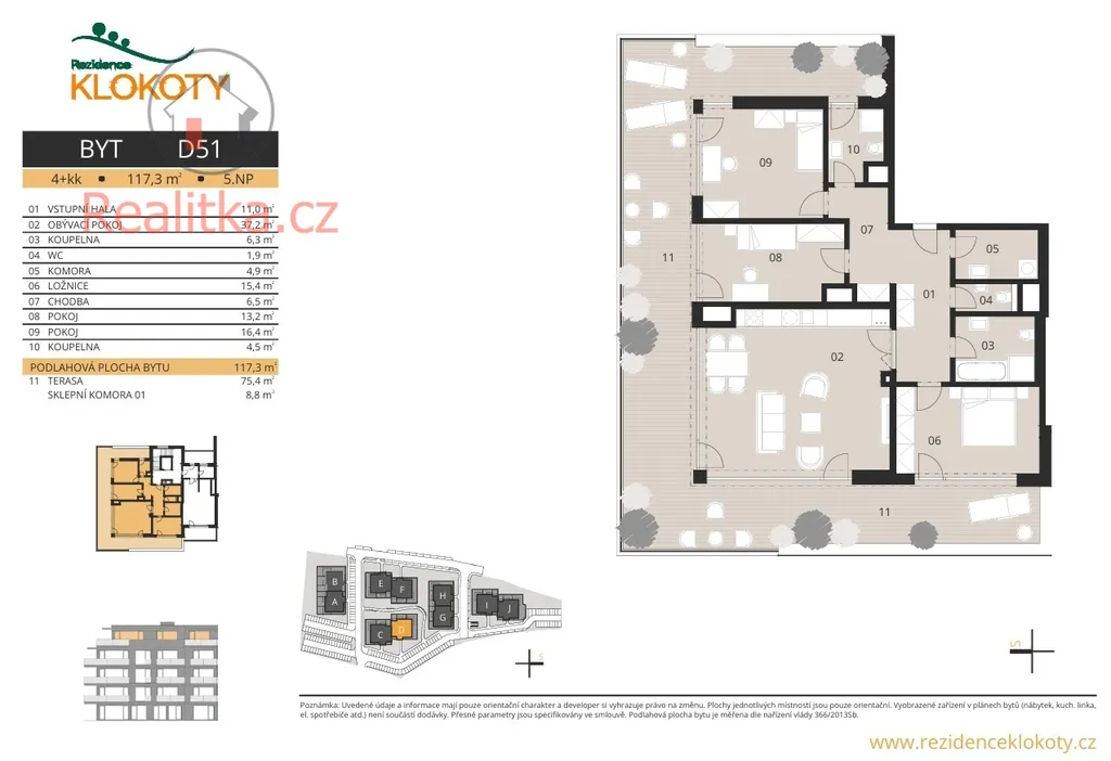 Penthouse D51 se nachází v domě CD. Zahájení výstavby etapy CD, která navazuje na etapu AB ve výstavbě, je předpokládáno na podzim 2026, dokončení v první polovině roku 2028. Všechny domy v projektu Rezidence Klokoty jsou navrženy s energetickou náročností budovy A. Průkaz PENB v klasifikační třídě A = mimořádně úsporná budova. Byt je možné financovat hypotečním úvěrem, s jeho vyřízením včetně zvýhodnených podmínek pro developerský projekt Rezidence Klokoty vám rádi pomůžeme.