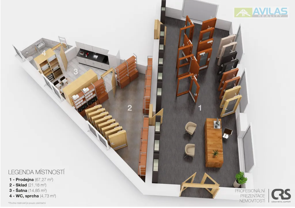 Nabízíme k pronájmu obchodní prostor o celkové užitné ploše 105 m2. Novostavba se nachází u hlavní silnice (ulice Jílovská) v komerčně - obytné zóně na okraji Týnce nad Sázavou (velký komerční potenciál). Prostory jsou vhodné jako showroom (okna, dveře, podlahy, koupelny...), obchod, sídlo firmy, ordinace, pobočka, obchod, drobná výroba apod. Dispozice: prodejna 67,27 m2, sklad 21,05 m2, šatna s kuchyňkou 14,77 m2, koupelna s wc 4,73 m2. Podlaha dlažba, plastová okna - trojsklo, zabezpečovací systém. Parkování před budovou. Prostor má samostatné měření elektřiny, plynu a vody. Benešov 10 km, Praha Chodov 34 km. Volné od 1.4.2026