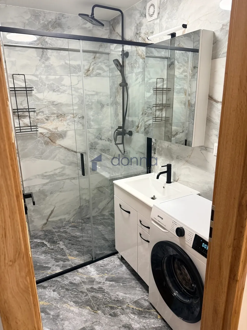 2 ložnice plně vybavené nábytkem (lůžko 180x200 s matrací, šatní skříň, komoda, psací stůl). Dále chodba s velkou skříní, plně vybavená kuchyň s jídelním prostorem, kde se nachází jídelní stůl a židle, koupelna se sprchovým koutem, umyvadlem se skřínkou a zrcadlem, pračka, topný žebřík, samostatné WC s umyvadlem s zrcadlem, komora nebo šatna.