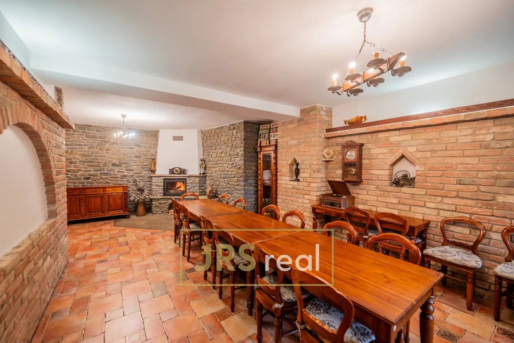 Za předsíňovými dveřmi se otevírá stylová společenská místnost s krbem, která vytváří jedinečnou atmosféru pro posezení, degustace či soukromé akce. Nechybí zde ani potřebné zázemí včetně sociálního zařízení a prostoru pro přípravu občerstvení. Na tuto část navazuje prostorná, plně vybavená kuchyně o velikosti 19 m².