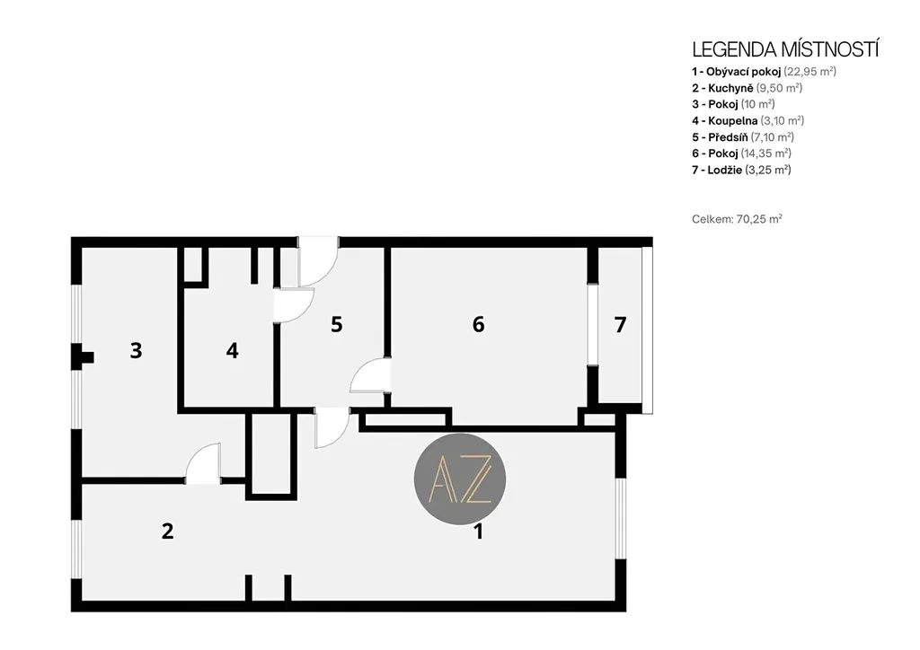 Z předsíně se vstupuje do pokoje (pracovna nebo dětský pokoj) s lodžií a do koupelny s WC. Na konci chodby se nachází kuchyně s jídelním koutem spojená s obývacím pokojem. Z kuchyně se vchází do ložnice.