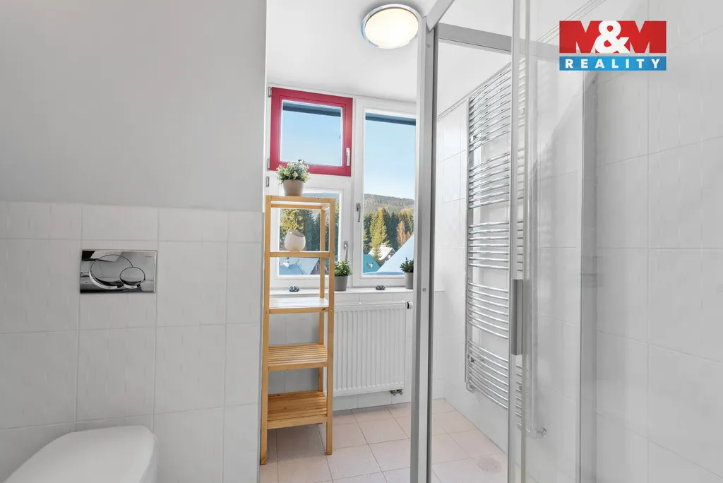 Nabízíme k prodeji krásný prakticky řešený podkrovní byt 2+kk o celkové rozloze 53 m2 + parkovací stání v klidné části města Harrachov. Byt je velmi vkusně zařízený, plně vybavený, poslední roky téměř nevyužívaný. Dispozičně je šikovně řešený tak, aby vznikly 2 samostatné ložnice, ale zároveň byl zachován obývací pokoj s kuchyňským koutem. V bytě je dále koupelna (s podlahovým vytápěním) se sprchovým koutem a WC a komora přístupná z chodby. Nemovitost se nachází v uzavřeném bytovém resortu Resident Harrachov, kde je též i parkovací stání patřící k bytu vymezené samostatným parcelním číslem. K bytu dále patří sklep v suterénu domu. Samotná nemovitost je zděná, ve velmi dobré kondici s vlastní kotelnou. Celý komplex se nachází v klidné části města přitom s výbornou dostupností do centra. Lyžařské středisko je cca cca 1,5 km, bobová dráha a lanové centrum 300m. Pokud hledáte útulný plně vybavený apartmán na klidném místě, ale v srdci Krkonoš, pak je pro Vás tato nemovitost ideální.
