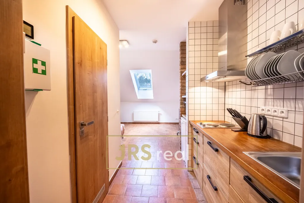 Ve výhradním zastoupení majitele nabízíme k pronájmu útulný a prakticky řešený byt o dispozici 2+kk a rozloze 34 m², situovaný v 1. patře domu se společným vstupem. Byt je ideální pro jednotlivce nebo pár, kteří hledají klidné bydlení s příjemným zázemím a možností relaxace. Dispozice bytu tvoří obývací pokoj s kuchyňským koutem, samostatná ložnice a koupelna se sprchovým koutem a toaletou. Byt působí kompaktně a účelně, nabízí vše potřebné pro pohodlné každodenní fungování. Součástí je sdílená terasa o velikosti 9,62 m² na patře. K dispozici je také společný venkovní prostor s posezením, možností grilování nebo využití udírny, což poskytuje ideální místo pro relaxaci či setkávání s přáteli. Kuchyňský kout je vybaven kuchyňskou linkou, elektrickým sporákem se dvěma plotýnkami, lednicí, mikrovlnnou troubou a základním nádobím. Ložnice nabízí dvoulůžko, televizi a rozkládací gauč. Byt má k dispozici společnou TV anténu (DVB-T2), klimatizaci a vlastní parkovací stání pro jedno auto. V celém objektu je využíváno ekologické řešení – splachování pomocí tzv. šedé vody ze studny a částečné využití fotovoltaiky pro snížení provozních nákladů. Na rozsáhlém pozemku se navíc nachází nabíjecí stanice pro elektromobily. Byt je vhodný pro nenáročné zájemce, kteří hledají klidné prostředí s dobrou dostupností a příjemným zázemím. Byt je ihned k nastěhování. V případě zájmu o prohlídku kontaktujte makléře.