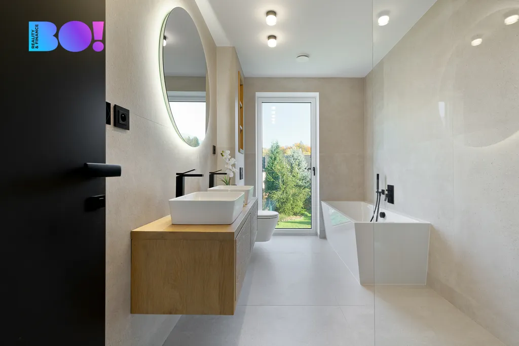 Interiér je sjednocen dubovými podlahami a nábytkem vyrobeným na míru z dubové dýhy. Kuchyňská linka v nadčasové kombinaci černého matného materiálu FENIX a dubu je vybavena prémiovými spotřebiči Siemens včetně indukční varné desky s integrovaným odsáváním, parní trouby, vestavěného kávovaru, vinotéky, myčky, lednice a mrazáku.