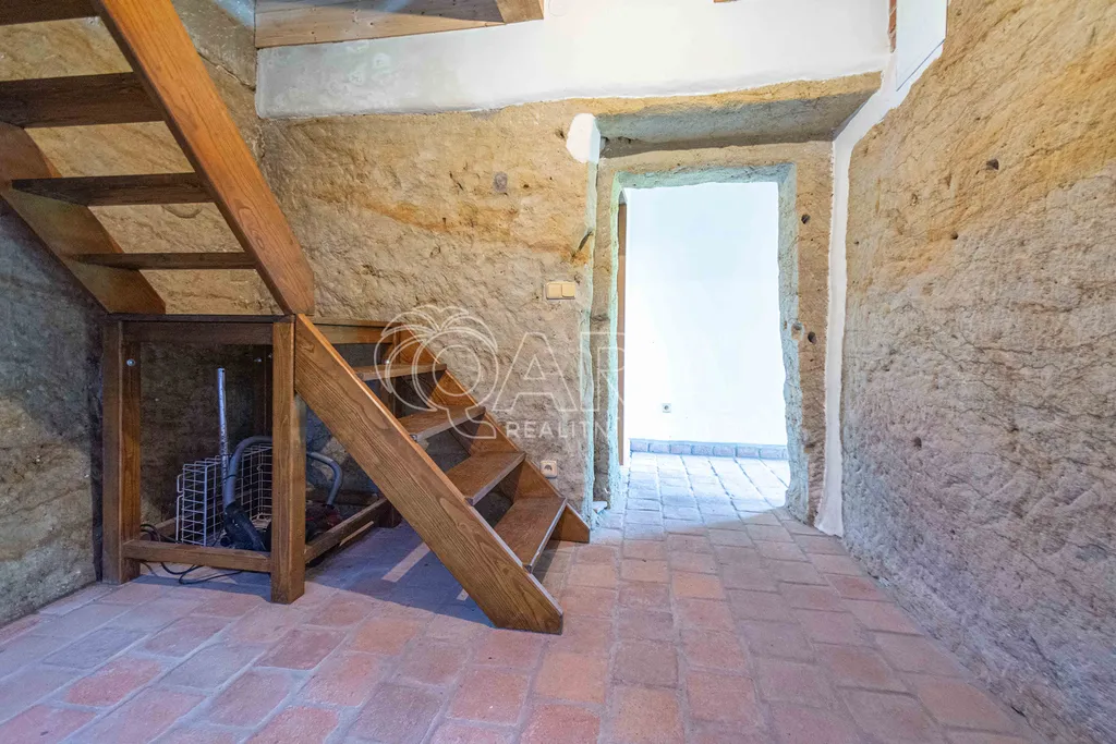 Dispozice: vstupní chodba ze které je vstup do skalního sklepa, koupelna se sprchovým koutem a WC zapuštěným ve skále, obývací pokoj s krbem, kuchyně taktéž zapuštěná do skály, pokoj v suterénu a otevřené horní patro, sloužící jako ložnice. Venku technická místnost s motorovým proudem, dílna a další sklep, vše zapuštěné ve skále s vlastním vchodem.