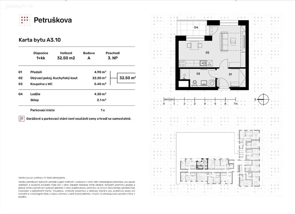 Byt A3.10 o dispozici 1+kk nabízí prostornou vstupní chodbu, z které se dostanete do obývacího pokoje s kuchyňským koutem. Z pokoje je přístup na lodžii orientovanou do zeleně. Koupelna je vybavena sprchovým koutem. Součástí bytu je také sklad umístěný v 1. NP a parkovací stání před domem.