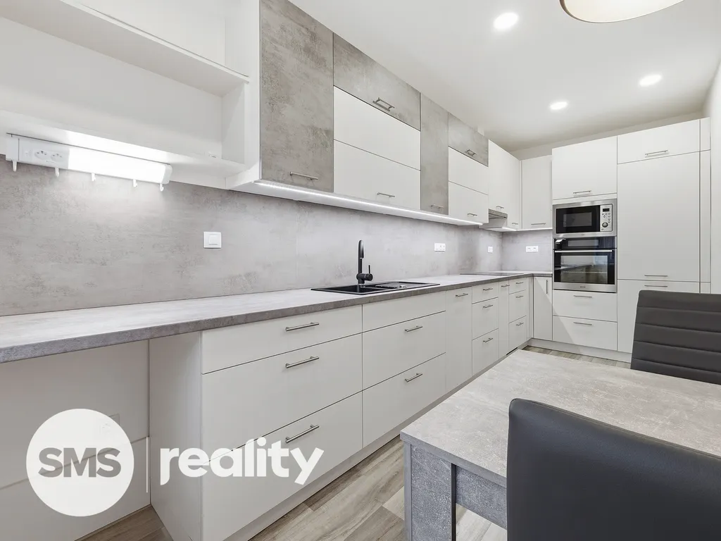 Srdcem bytu je prostorná kuchyňská linka osazená kvalitními vestavěnými spotřebiči značky Gorenje. Interiér se pronajímá částečně vybavený. Veškerý nábytek a doplňky zachycené na fotografiích v bytě zůstávají.